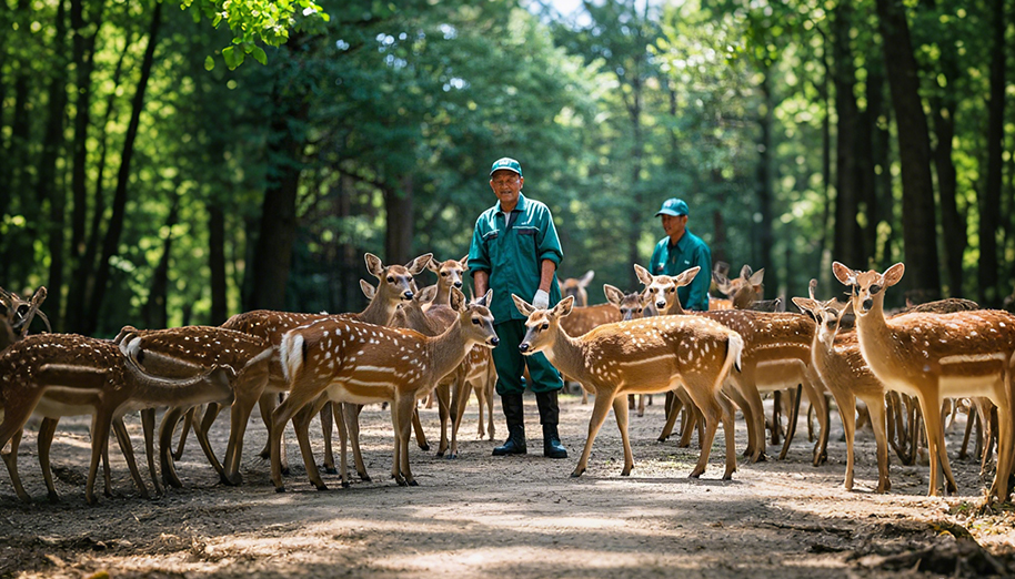 其中“京西鹿谷梅花鹿生態(tài)養(yǎng)殖繁育基地”,群山環(huán)繞、空氣清新、水源優(yōu)質且充足,為梅花鹿的生長營造了良好的自然條件?;貎戎脖回S富,有大量梅花鹿喜愛的嫩草和樹葉,充足的食物資源保障了梅花鹿飲食的多樣性。同時開闊的空間和適宜的氣候條件,為梅花鹿的生存提供的得天獨厚的優(yōu)勢,使其能夠自由地繁衍生息。